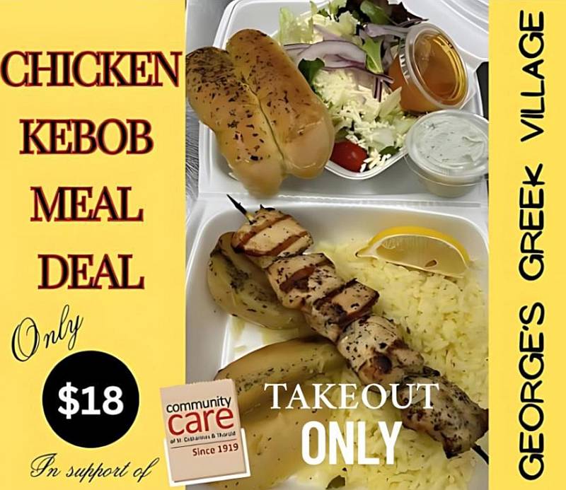 George has “got the job done” for years now with his continuing Chicken Kebob Takeout Meal Deal initiative that donates $2 to Community Care for each sale and now has reached an astounding $68,888.00!Â