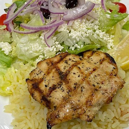 Boneless chicken breast lightly seasoned Served with rice and greek salad.