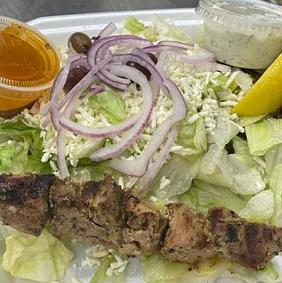 Pork or chicken Souvlaki stick with greek salad (feta cheese, tomatoes, black olives on crisp lettuce mixed with our secret dressing), served with tzatziki.